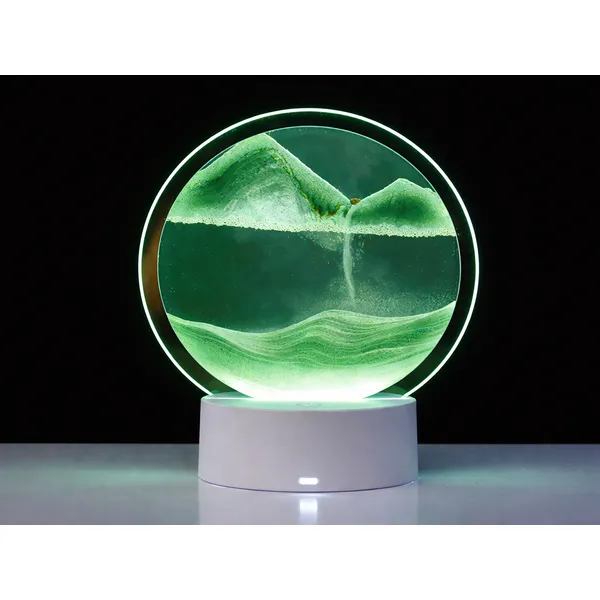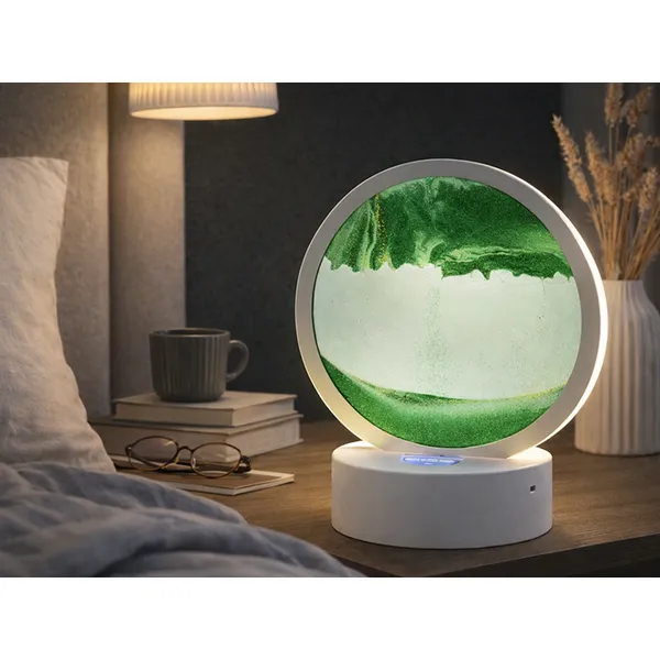 Nyugtató, folyamatosan változó 3D homokminták és hangulatos RGB LED fény egy elegáns asztali dekorációban. USB-ről vagy elemmel is használható, így könnyen áthelyezhető a nappaliba, hálóba vagy az irodába.