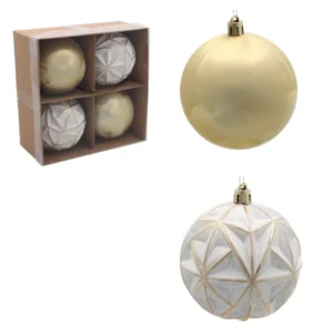 Varázsolj ünnepi hangulatot otthonodba ezzel a 4 darabos karácsonyfadísz szettel! A 8 cm átmérőjű, vegyes mintázatú gömbök harmonikusan illeszkednek modern és klasszikus dekorációkhoz egyaránt. Tartós műanyag kivitelük ellenáll a törésnek, így gyermekes családok és háziállat-tulajdonosok számára is biztonságos választás.