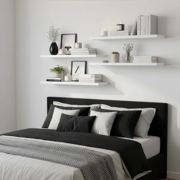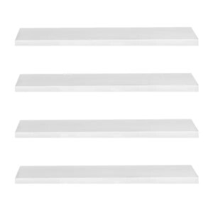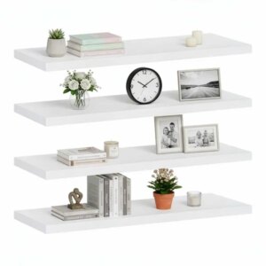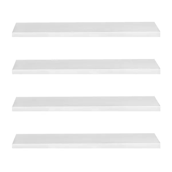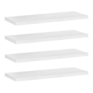 4 darabos falipolc szett fehér MDF polclapokkal és fekete fém tartókkal, modern megjelenéssel. A rögzítőelemek és a mini vízmérték a csomagban vannak, így gyorsan és pontosan felszerelhető, hogy könyveknek, dekorációknak vagy apróságoknak stabil helyet adjon.