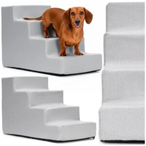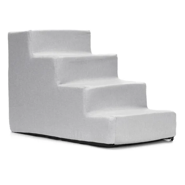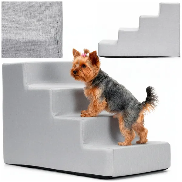 Kényelmes, 4 fokos kutyalépcső, amely megkönnyíti a kanapéra vagy ágyra feljutást, miközben kíméli az ízületeket. A csúszásgátló talp stabil tartást ad, a cipzáras, levehető huzat pedig egyszerűen tisztán tartható a mindennapokban.