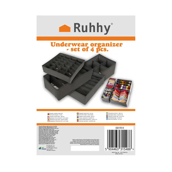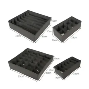 4 részes fehérnemű rendszerező szett, amely segít rendet tartani a fiókokban és szekrényekben. A különböző rekeszméretű tárolók ideálisak zoknik, melltartók, bugyik, nyakkendők és más kisebb ruhadarabok átlátható elrendezéséhez.