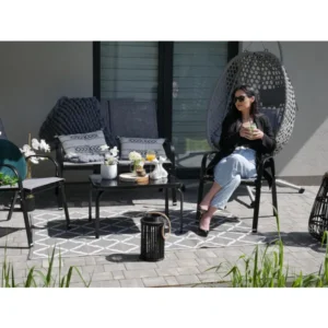 Egészítse ki balkonját vagy teraszát ezzel a modern, mégis időtálló kerti bútor garnitúrával! A 4 részes szett 2 rakásolható széket, egy kétszemélyes kanapét és egy edzett üveglappal ellátott dohányzóasztalt tartalmaz, így kényelmes helyet biztosít a reggeli kávézáshoz vagy baráti beszélgetésekhez. A porfestett acél váz stabil tartást, a sűrű, légáteresztő textilén szövet pedig optimális komfortot nyújt a forró nyári napokon is.