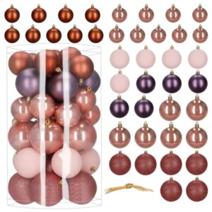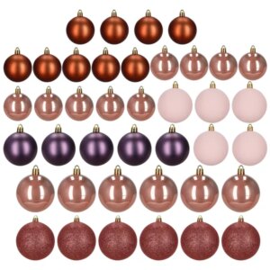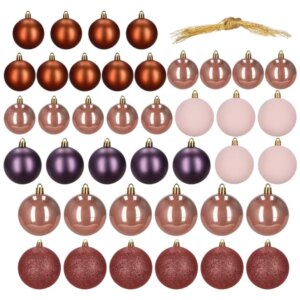 A 40 darabos, törhetetlen műanyag gömbdíszkészlet lila, barna, gyöngyház és rozéarany árnyalatokban minden karácsonyfát egyedivé varázsol. A könnyű díszeket a mellékelt zsinórok segítségével azonnal felakaszthatod, így időt spórolsz és biztonságosabbá teszed a dekorálást gyerekek vagy kisállatok mellett.