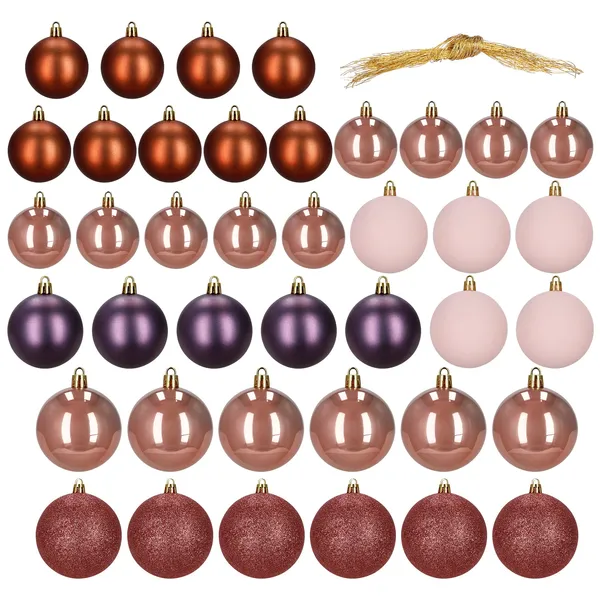 A 40 darabos, törhetetlen műanyag gömbdísz szett fényes, matt és csillámos felületeivel, valamint lila, barna, gyöngyház és rozéarany színeivel változatos, mégis harmonikus karácsonyfadekort kínál; a mellékelt zsinórokkal gyorsan és biztonságosan felhelyezhető.