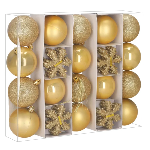 Az arany színű díszek elegáns, ünnepi hatást adnak a fának, a különböző felületek pedig szépen megtörik a fényt. A törhetetlen műanyag anyag ideális választás gyerekek és háziállatok mellé is, az ingyenes akasztókkal pedig gyorsan és egyszerűen feltehetők.
