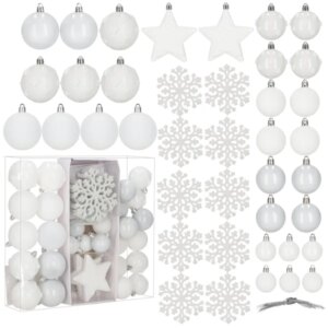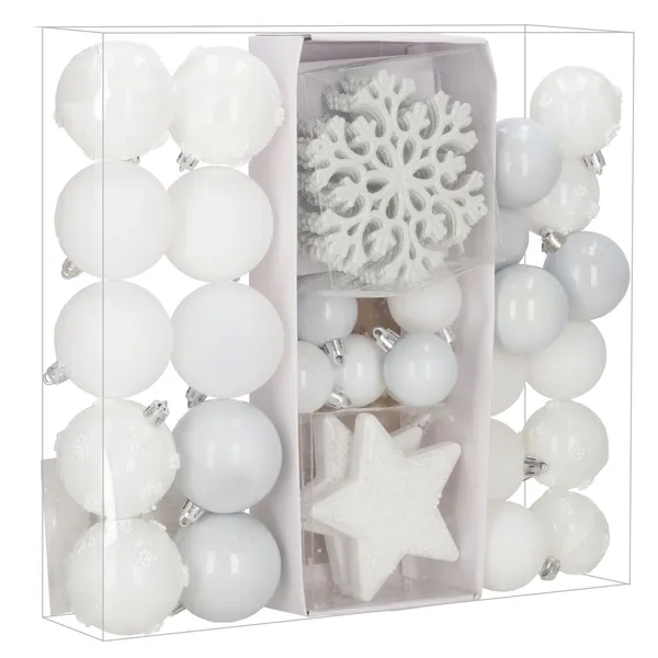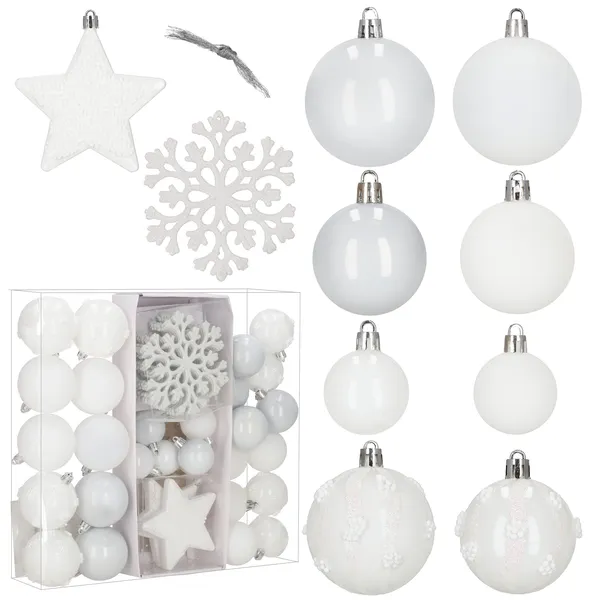 Fehér, törésbiztos karácsonyfa díszszett 40 darabbal, többféle felülettel (matt, fényes, csillámos) az elegáns, egységes összhatásért. Műanyag kivitelének köszönhetően biztonságosabb választás gyerekek és háziállatok mellett is, az akasztó zsinórok pedig ajándékba járnak.