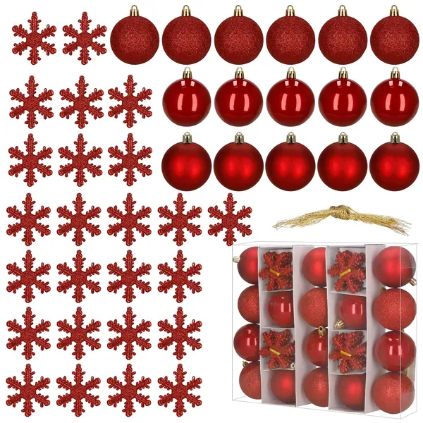 Tedd ünnepivé a fát egy 40 darabos, piros díszszettel, amelyben matt, fényes és csillámos elemek is vannak az egységes, mégis változatos megjelenésért. Törhetetlen műanyag kivitelének és a mellékelt akasztózsinóroknak köszönhetően gyorsan díszíthetsz, aggódás nélkül.