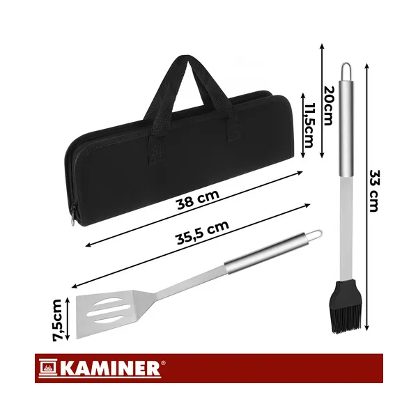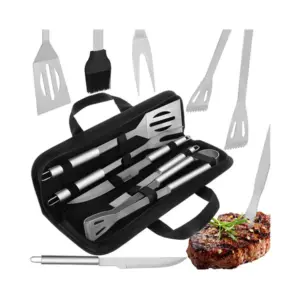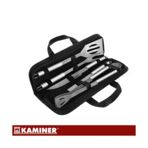Minden fontos grill eszköz egy erős tokban, így gyorsan indulhat a sütés otthon vagy útközben is. A rozsdamentes acél kivitel, a hosszú nyelek és a rendezett tárolás kényelmesebb, biztonságosabb használatot nyújtanak.