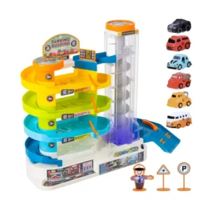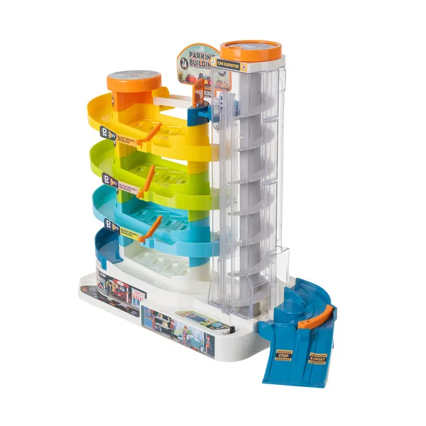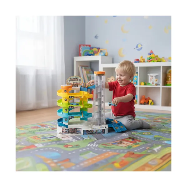 Interaktív, 5 szintes játék parkolóház spirál lifttel, ahol az autók folyamatosan körbegurulnak a pályán a látványos „felvonózás” után. A 6 mellékelt autóval és a sorompókkal játékosan fejleszti a finommotorikát, a koordinációt és a közlekedési helyzetek megértését, ráadásul könnyen összecsukható.