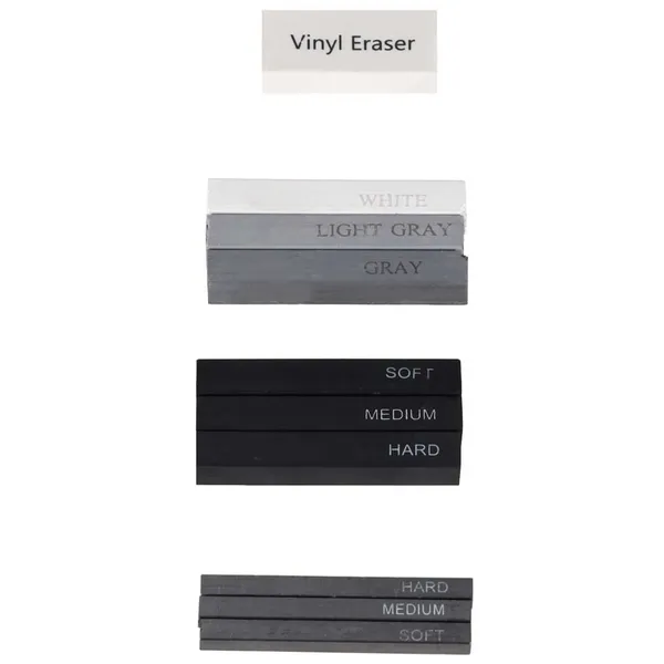 - Két radír (klasszikus és gyúrható) precíz javításhoz, halványításhoz és kiemelésekhez.