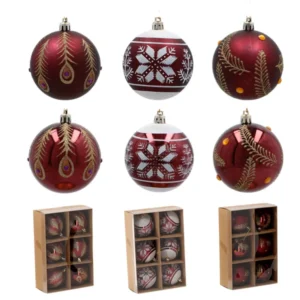 A 6 darabos, 8 cm-es sötétvörös karácsonyi gömbkészlet tartós, törésbiztos műanyagból készült, így biztonságos választás családok számára. Az előre felszerelt akasztókkal gyorsan és egységesen dekorálhatod vele a fenyőt vagy más ünnepi helyszínt.