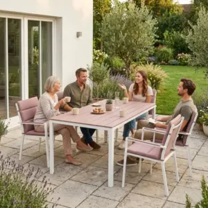 Tágas kültéri asztal 6 fő részére, amely kényelmes helyet ad közös étkezésekhez, grillezéshez és baráti beszélgetésekhez. A fa hatású, könnyen tisztítható polywood lap és a stabil, korrózióálló acél váz jól bírja a mindennapi terasz- és kerti használatot.