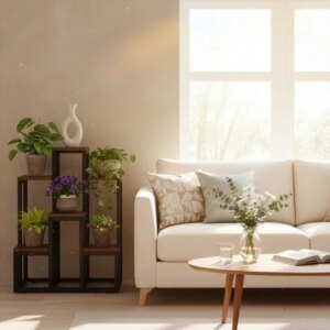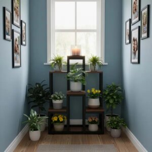 Rendezze növényeit átláthatóan 6 polcon, stabil fa-fém vázzal és helytakarékos kialakítással. A csúszásgátló, szintezhető talpak segítenek, hogy egyenetlen felületen is biztosan álljon, így otthonra, erkélyre vagy fedett teraszra is ideális.