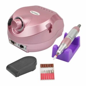 65 W-os rózsaszín körömcsiszoló gép 45 000 RPM, pedállal, fejjel és marókkal