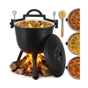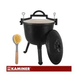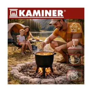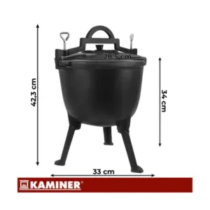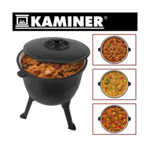 Az öntöttvas test egyenletes hőeloszlást biztosít, a zománcozott belső felület pedig megkönnyíti a tisztítást, így kényelmesen készíthet nagyobb adag egytálételeket a szabadban. A levehető lábak, a fedő és a mellékelt tisztítókefe praktikusabb használatot és egyszerűbb szállítást adnak.
