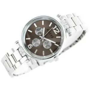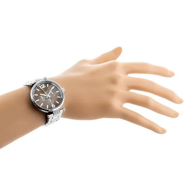 Elegáns, letisztult megjelenésű női кварc karóra barna számlappal, ezüstszínű tokkal és fém szíjjal. A kerek tok és a visszafogott dizájn könnyen illeszkedik a hétköznapi és az alkalmi öltözékhez is.