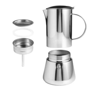 Élvezd otthon a klasszikus, olasz stílusú eszpresszó intenzív aromáját az Adler AD 4417 kotyogós kávéfőzővel! A rozsdamentes acél kivitel prémium megjelenést és tartósságot ad, miközben a használata egyszerű: tölts vizet az alsó tartályba, tedd bele az őrölt kávét a szűrőbe, csavard össze, és már mehet is a tűzhelyre.