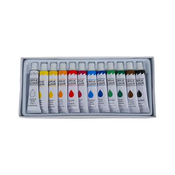 • 12 db akrilfesték (12 ml/tubus): élénk színek, vízbázisú, gyorsan száradó, keverhető és tartós felületet ad.