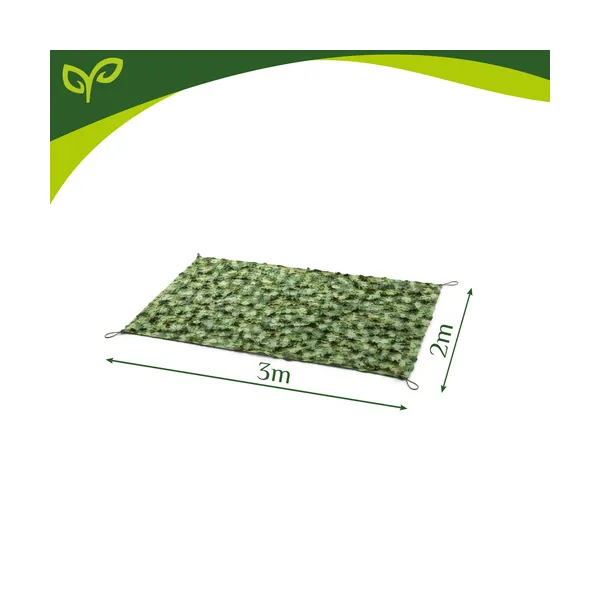 Gyorsan rögzíthető 2×3 m-es álcaháló, amely hatékonyan ad árnyékot és belátás elleni védelmet a kertben, kerítésen vagy kempingben. Vízálló, gyorsan száradó anyaga eső után is hamar használható, a csomagban lévő 100 kötegelővel pedig percek alatt stabilan felszerelhető.