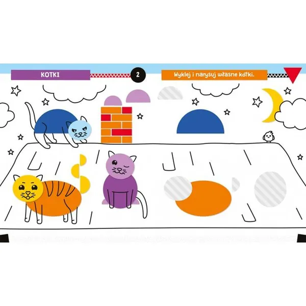 Az „Állatok a vidéken” ragasztós rajzkönyvben a 4 évesnél idősebb gyerekek színes matricákat ragaszthatnak be, majd egyszerű vonalakkal kiegészíthetik a képeket, így elevenítve meg a tanyasi állatokat és a geometriai formákat.