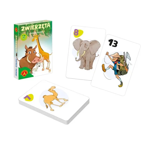 Állatos kártyajáték vidám, színes illusztrációkkal, amely két klasszikus játékot kínál egy csomagban: Fekete Péter és memória. A humoros állatfigurák (például mókás majom vagy álmos oroszlán) játék közben is lekötik a gyerekek figyelmét, így ideális választás családi estékhez.