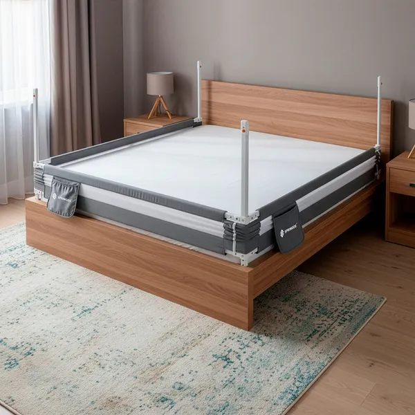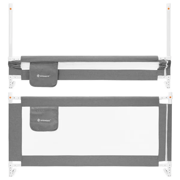 Az állítható magasságú ágyvédő rács segít megelőzni, hogy a gyermek alvás közben leguruljon az ágyról. A stabil, rozsdamentes acél váz és a tartós Oxford szövet megbízható védelmet ad, a bevarrt zseb pedig praktikus helyet kínál a cuminak, kendőnek vagy mesekönyvnek.