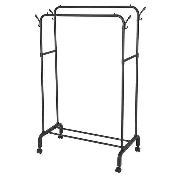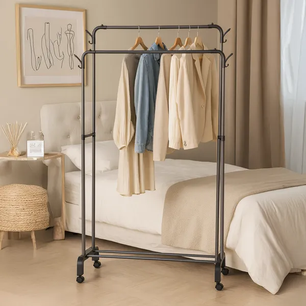 Az álló, dupla ruhatároló állvány ideális megoldás, ha kevés a hely, mégis rendszerezetten szeretné tárolni kabátjait, ingeit és cipőit. A két egymástól független, állítható magasságú rúd nagy kapacitást biztosít, az alsó cipőtartó polcon pedig akár több pár lábbeli is elfér. A beépített, fékezhető kerekeknek köszönhetően egyszerűen mozgatható a lakás bármely pontjára.