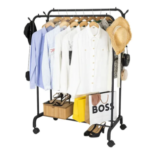 Álló dupla ruhatároló állvány kerekeken cipőtartó polccal