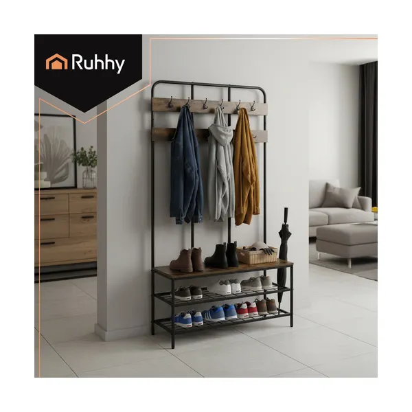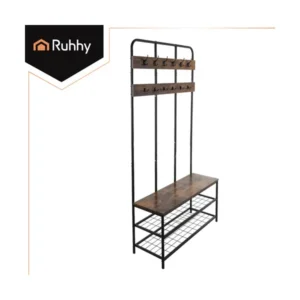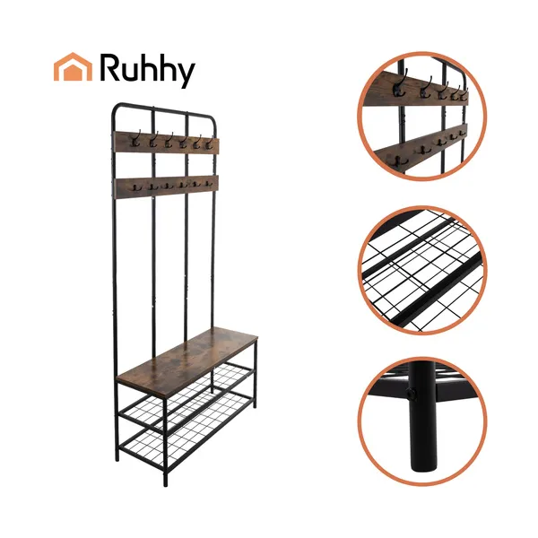 Ez az álló előszobai fogas praktikus megoldás a rendezett bejárathoz: kabátoknak, táskáknak és sálaknak 12 erős akasztó, a cipőknek pedig 2 tágas polc áll rendelkezésre. A meleg fa hatású ülőfelület kényelmes cipőfelvételt tesz lehetővé, miközben a loft stílusú, fekete fém váz modern megjelenést ad a térnek.
