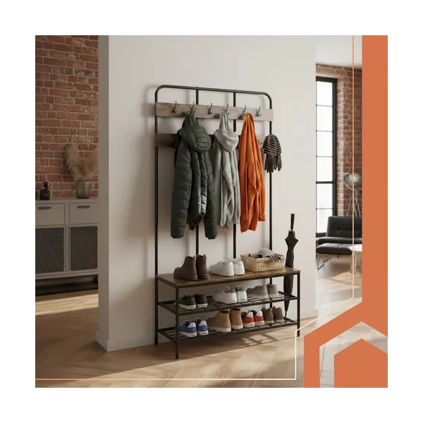 Rendezd az előszobát egy stabil, loft stílusú álló fogassal: 12 erős akasztóval, két cipőpolccal és kényelmes ülőpaddal egyszerre tárolhatsz kabátot, táskát és lábbelit. Padlóvédő talpai óvják a burkolatot, így a mindennapokban is praktikus és esztétikus megoldás.