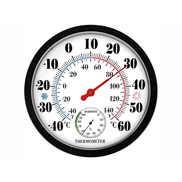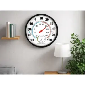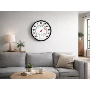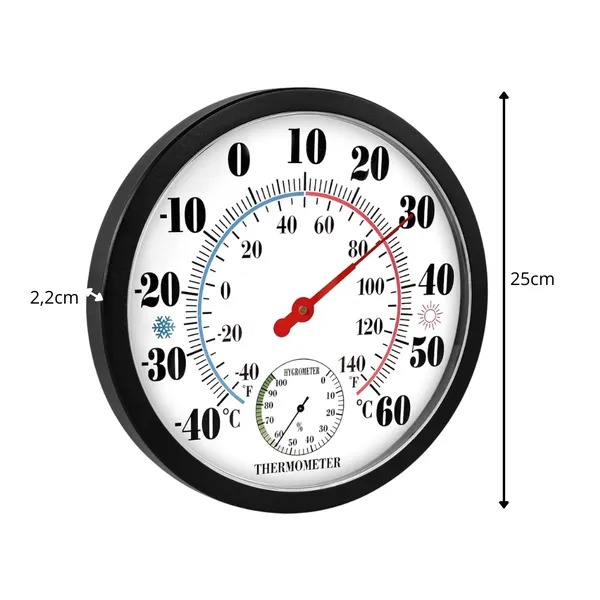 Analóg fali hőmérő és páratartalom-mérő, amely segít gyorsan ellenőrizni a helyiség klímáját otthon vagy munkahelyen. A nagy, kerek számlapnak köszönhetően az értékek távolabbról is jól leolvashatók, így praktikus választás konyhába, nappaliba, irodába, garázsba vagy akár teraszra is.