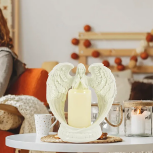 A pislákoló LED-es angyal gyertyatartó kellemes, gyertyafényes hangulatot teremt csöpögés és füst nélkül. Polírozott, időjárásálló gyantatestének köszönhetően tartós és biztonságos dísz beltéri vagy kültéri használatra is.