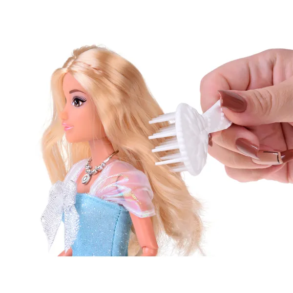 Mesebeli téli hangulat egy csillogó kék ruhás babával, tiarával és nyaklánccal. A hosszú, fésülhető haj és a mozgatható végtagok segítik a történetmesélést, a készletben lévő hajkefe pedig rögtön induló játékot ad.