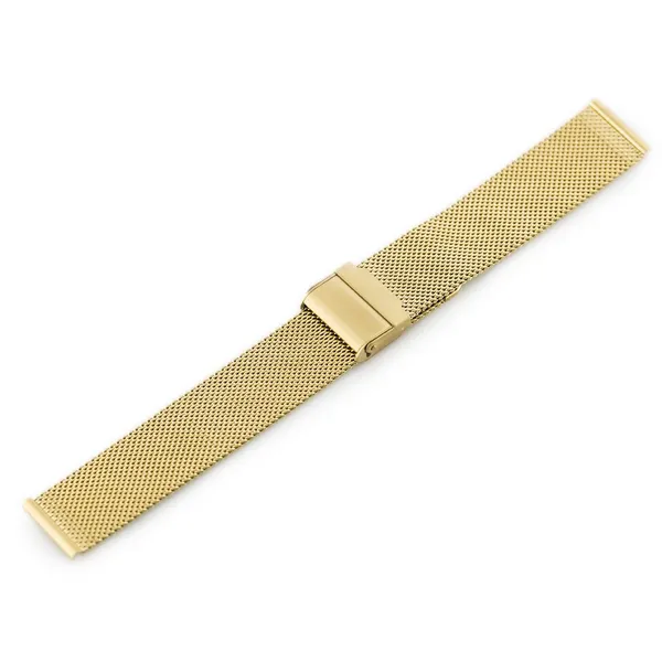 Elegáns, arany színű milánói szövésű fém óraszíj, amely kényelmesen állítható a pontos illeszkedés érdekében. A biztonsági zárral ellátott csat megbízható viseletet és stabil rögzítést biztosít a mindennapokban.