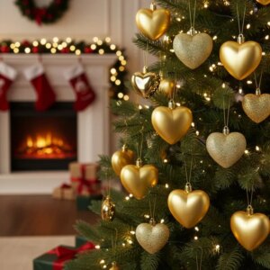 Arany szív alakú karácsonyfadísz szett elegáns, ünnepi megjelenéssel: fényes, félmatt és csillámos felületek váltakoznak, így a fa díszítése változatos és harmonikus lesz. A díszek műanyagból készültek, ezért törhetetlenek, ideálisak gyermekes családoknak és kisállat mellé is.
