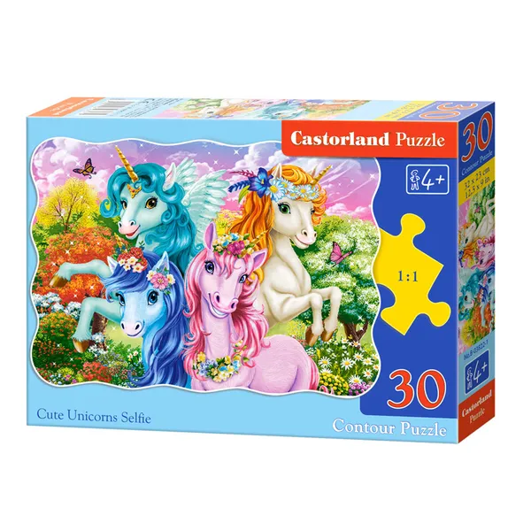 Varázslatosan színes, unikornisos szelfi témájú puzzle a legkisebbeknek – tökéletes választás az első komolyabb kirakók világába. A 30 darabos midi puzzle összerakása után egy kedves, részletgazdag kép áll össze, amely játék közben fejleszti a gyerekek készségeit.