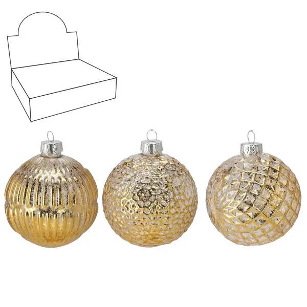 Kézzel fújt üveg gömb aranyozott felülettel és változatos mintákkal, amely finoman szórja a fényt, így a fenyő látványosan ragyog. Tartós bevonata és díszdobozos csomagolása gondoskodik róla, hogy éveken át megőrizd ünnepi fényét.