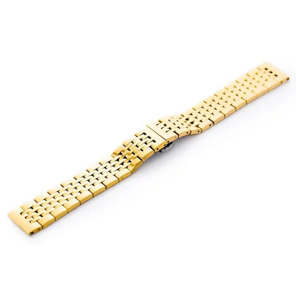 Aranyszínű, rozsdamentes acél óraszíj pillangócsattal, igényes megjelenésű karórákhoz. Elegáns kivitele kényelmes viseletet és biztonságos rögzítést biztosít a mindennapokban.