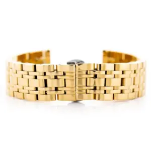 Aranyszínű acél óraszíj pillangócsattal, amely elegáns megjelenést és kényelmes viseletet kínál. Jó választás minőségi karórákhoz, ha tartós és esztétikus fém szíjat keres.