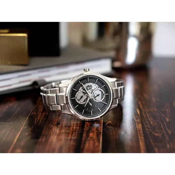 • Színvilág: fekete számlap, ezüst indexek és mutatók, ezüst tok és csat