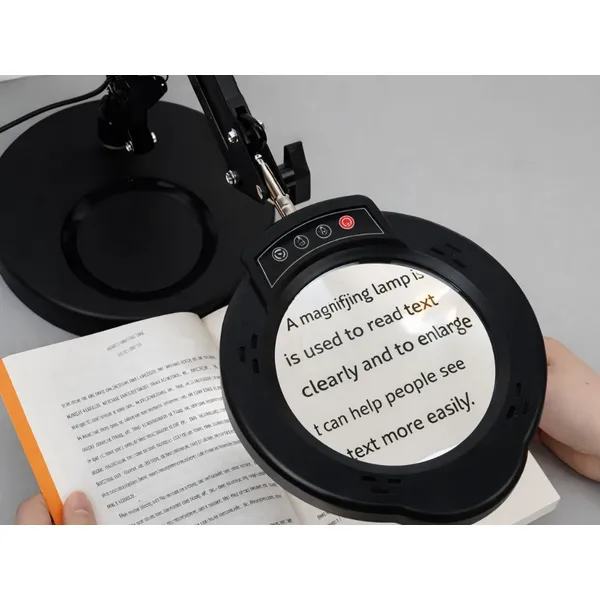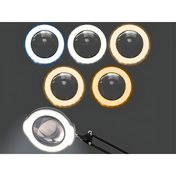 Asztali nagyítólámpa üveglencsével, amely akár 10×-es nagyítást biztosít a legapróbb részletek kényelmes megfigyeléséhez. Ideális finommechanikai munkákhoz, bőrvizsgálathoz, kozmetikai feladatokhoz, elektronikai szereléshez, modellezéshez vagy hobbi kézműves tevékenységekhez.