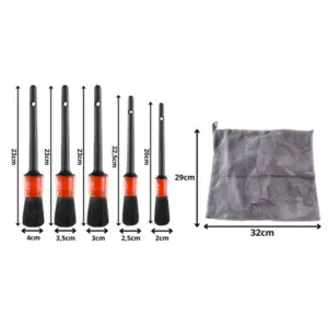 Az 5 különböző méretű detailing ecsettel gyorsan kitisztíthatod a szellőzőket, réseket, díszléceket és a felnit is, kíméletesen a műanyaghoz és a fényezéshez. A mellékelt mikroszálas kendővel egyszerű a törlés, a tisztítószer felvitele és a szárítás szöszmentesen.