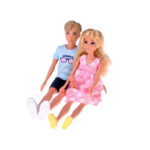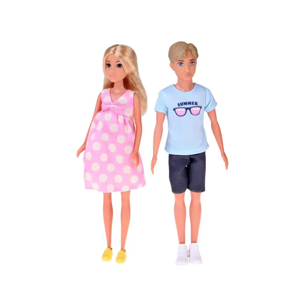Az apababa kék szemű, szőke, laza nyári szettben érkezik: kék póló, rövidnadrág és fehér sportcipő. Az anyababa hosszú, világos haját könnyű fésülni és formázni, finom sminkje kiemeli mogyoróbarna szemét. Rózsaszín, pöttyös kismamaruhát és sárga cipőt visel. A különlegesség a kinyitható pocak, amelyből kivehető a parányi baba – játékosan segít feldolgozni és megérteni a család bővülését. Mindkét babának mozgatható végtagjai vannak.