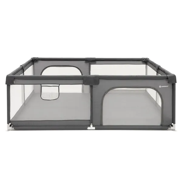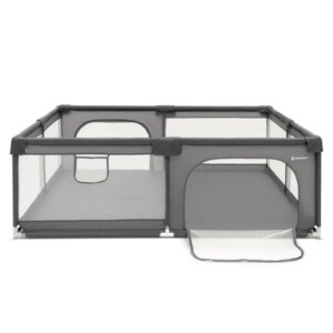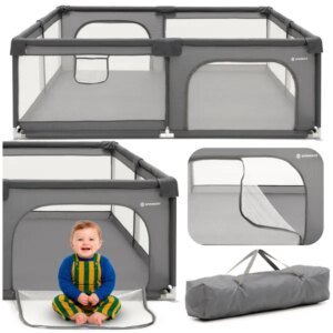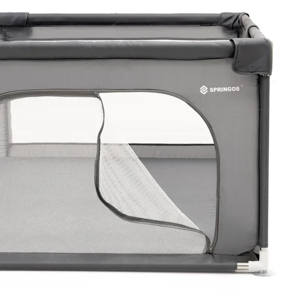 Baba járóka 150×180 cm, szürke hálós, acél vázzal és cipzáras ajtóval