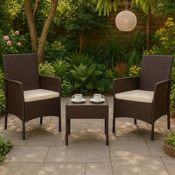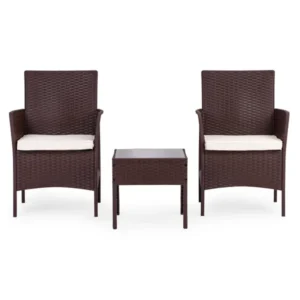 A 2 személyes, barna polyrattan hatású kerti bútor szett két kényelmes fotelt és egy edzett üveg asztalt tartalmaz, így ideális reggeli kávéhoz, baráti beszélgetésekhez vagy naplemente-nézéshez a teraszon.
