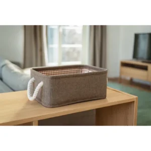 A barna, téglalap alakú tároló kosár segít rendszerezni a lakás minden szegletét, miközben természetes hatású fonása meleg, otthonos hangulatot teremt.
