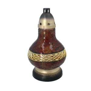 Őrizze meg az emlékezés meghitt fényét ezzel a barna, vitrázs hatású üvegből készült kis karafa formájú síremlék mécsessel. A klasszikus vonalvezetés és a meleg szín minden temetői környezetbe illik.