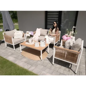A Belgrád 4 részes kerti bútor garnitúra elegáns, mégis praktikus megoldás erkélyre, teraszra vagy kertbe. A porszórt alumínium váz és a fa hatású polywood elemek garantálják a rozsdamentes tartósságot, míg a bézs, vastag habbal töltött párnák gondoskodnak a hosszan tartó kényelemről.