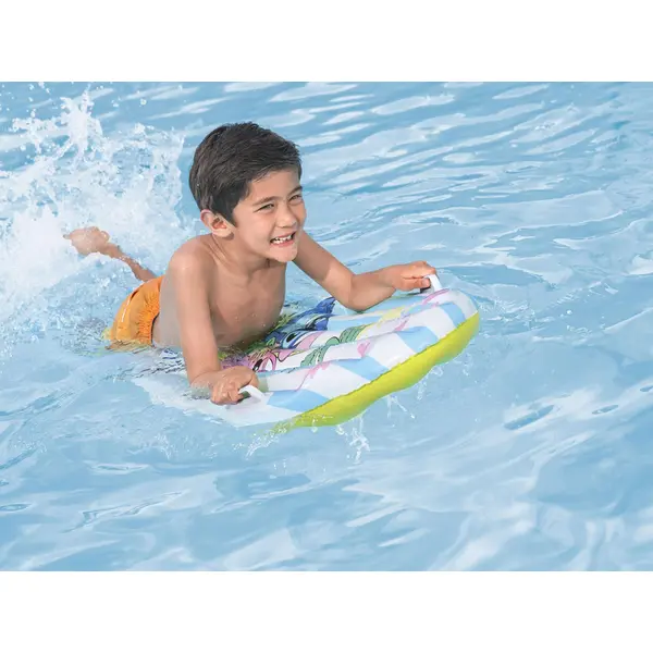 Szörfdeszka formájú, Lilo és Stitch mintás felfújható vízi matrac, amelyet a két erős fogantyúval a gyerekek könnyebben és biztonságosabban tudnak megfogni a vízben. Könnyű, kis helyen elfér, így medencéhez, tópartra vagy tengerhez is kényelmesen magaddal viheted.