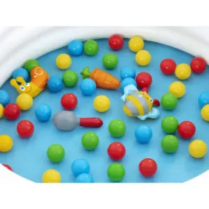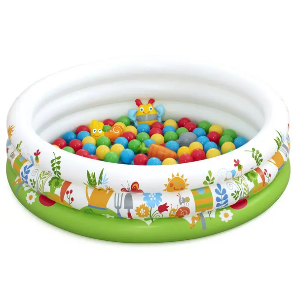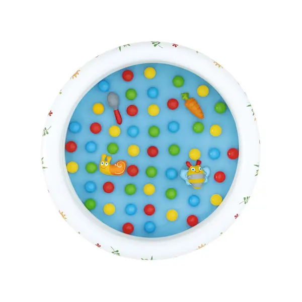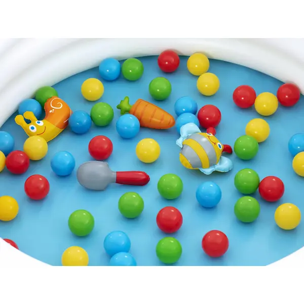 A stabil, három azonos méretű felfújható gyűrűből álló kialakítás kényelmes támaszt nyújt játék közben. A csomagban összesen 50 színes labda található, köztük 4 különleges, nyitható „meglepetés” labda apró játékkal a belsejében – ez a váratlan élmény ösztönzi a kíváncsiságot, a fantáziát és a kreatív szerepjátékot.